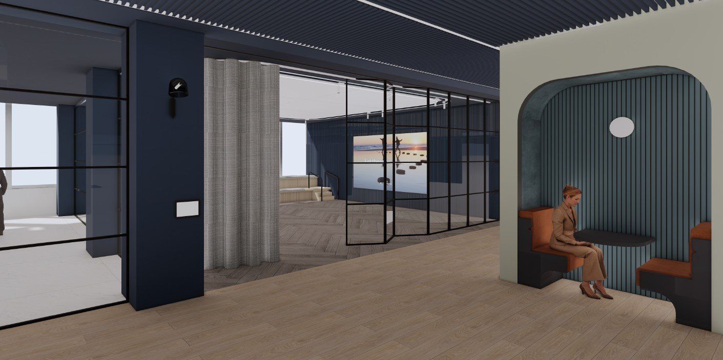 The key structural alterations included new sky-fold walls to maximise space in event rooms, new glass sliding doors spanning long distances and a barista lounge to supply an open break out area for the office.